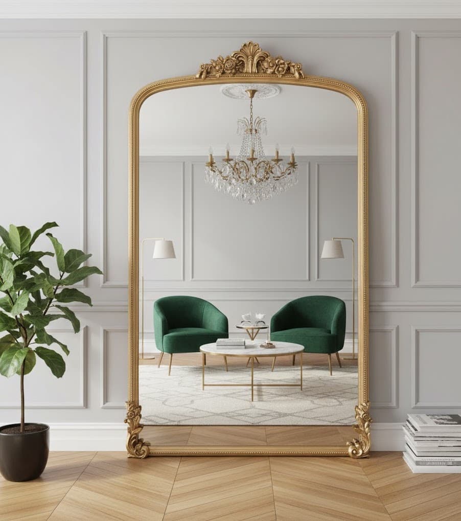 Роскошное арочное зеркало Excellence в резной золотой раме от Eurozerkalo — эффектный акцент для вашего интерьера. Высокая изящная форма, благородный оттенок золота и детализированный орнамент создают атмосферу аристократического шика. Универсальная установка — как напольное или навесное зеркало. Идеально для дома, салонов, бутиков и фотостудий.